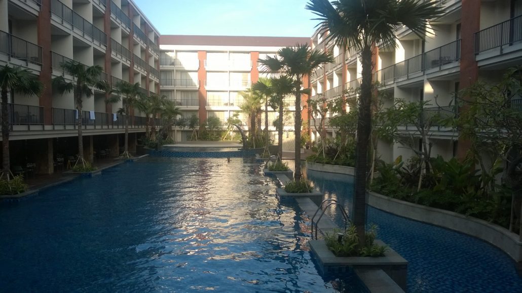 The unique item of this hotel in Bali ,is the swimmingpool, which is spreading from the left side of the building to the right side of the building. Directly from the unit, the hotel guests can have access to the pool. In the middle of this huge water area , an exercise pool is placed in rectangular shape. The pool has a spacious pool deck, which is located adjacent to the lobby area.