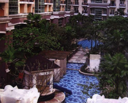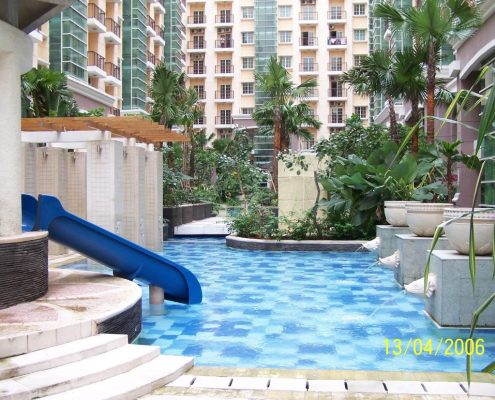 A 17 Ha area in the crowded Kelapa Gading district in Jakarta has been developed into an array of apartments complex. Each apartment has its own swimming pool with different style of design. The city house has mediteranian style with modern touch. The pool is located in the middle of apartment building and has a 100m length and a narrow of 15 m width. It is the longest swimming pool , that people can find in Jakarta.