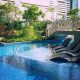 A hotel project in Bali , which has a large reflecting pond in the ground floor and swimmingpool in the 5th floor. The reflecting pond is spreading from the cafe lounge to the hotel wall and has 8 planter boxes , which is planted with unique characteristic frangipanis. The childpool is placed above the adultspool. A waterfall will flow down from one side of the adultspool edge. This waterfall can be seen as a water curtain from the ground floor.