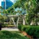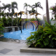 This is another hotel project in Bali with modern style design. The swimming pool is stretching along the building and located directly in the center of the building and at the back of lobby area. At the left and the right side of the pool you can find row of coconut trees as a barrier for the pool. The pool has a lower elevation than the lobby area and a terraced waterfall is placed to solve this elevations problem. In the middle of the pool there is an island that can be used for sun bathing or reading books. The composition of the green area is using balinese tropical plants.